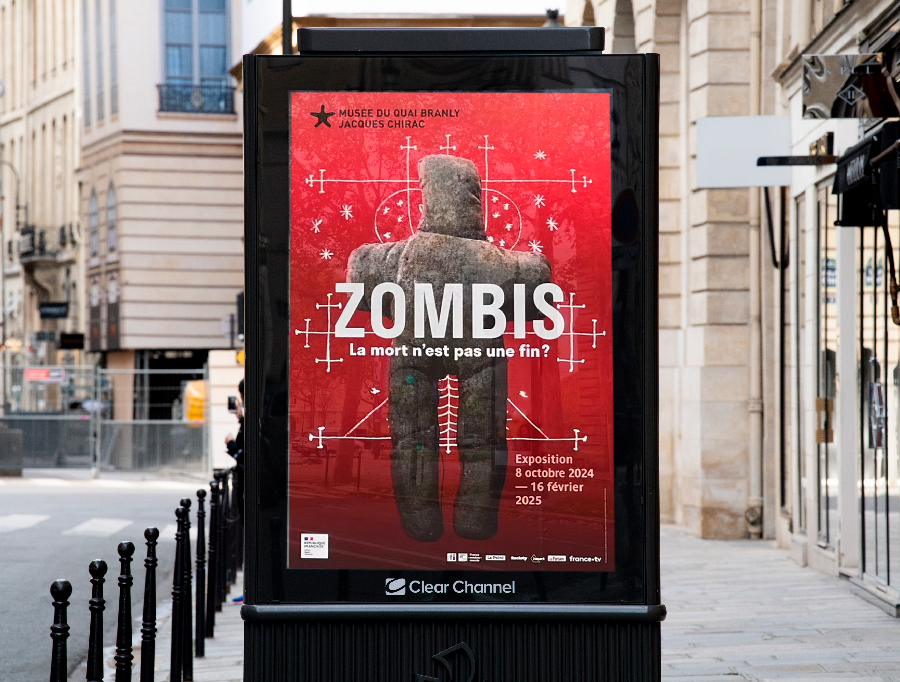L’exposition explore le phénomène zombi entre réalités culturelles haïtiennes et représentations contemporaines. Le choix de la poupée vaudou comme figure centrale s’impose par sa double dimension : objet rituel authentique et symbole universellement reconnaissable. En arrière-plan, le dessin du vévé de Maman Brigitte, l’esprit protectrice des cimetières, crée un univers mystique sur fond rouge vibrant.